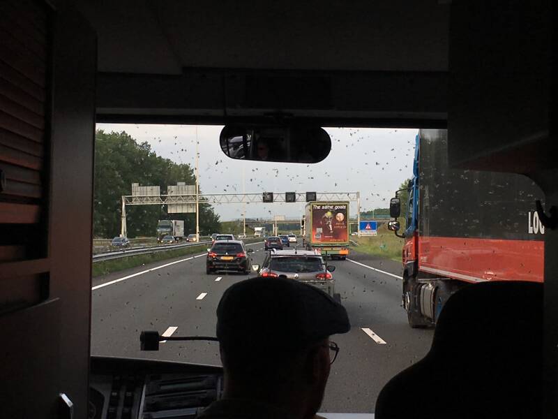 Je ziet daar een rooddak. Dat is de boot van ons, zodra we daar kwamen moesten we van de docenten de legitimatie of paspoorten pakken en uit de bus. We gingen naar een controle. Ook de bus werd gecontroleerd door politie honden en mensen. We hadden niets verkeerd bij ons en mochten zo verder.